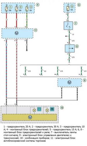 Система ABS имеет 2 вставки. Элемент №7 ответственен за насос давления жидкости. Восьмой предохранитель отвечает за электрический клапан стабилизации.