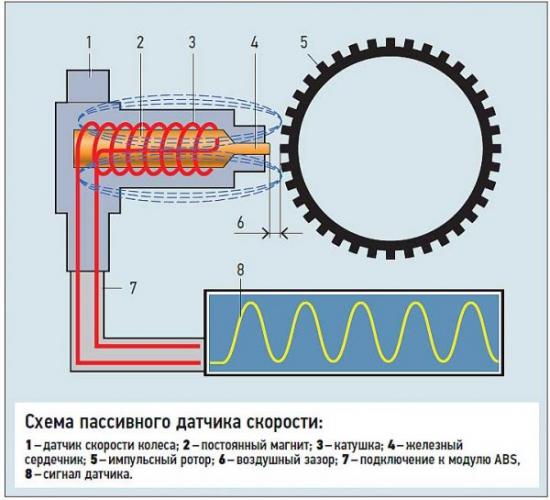 Суть их работы сводится к изменению напряжения от воздействия магнитного поля. Основной их недостаток – невозможность определения скорости вращения колеса на очень малых скоростях.