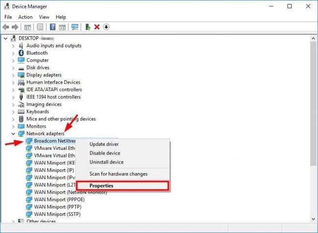 2. В диспетчере устройств дважды щелкните Сетевые адаптеры расширить эту категорию. Затем щелкните правой кнопкой мыши на ваш сетевой адаптер и выберите Свойства .