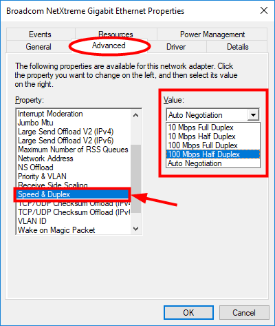 3. В окне свойств сетевого адаптера выберите Продвинутый вкладка выберите Скорость и дуплекс в Свойство меню и измените его Значение к значению кроме автосогласования . (Вы можете протестировать каждое значение и посмотреть, какое из них решит вашу проблему.) После этого нажмите Хорошо .