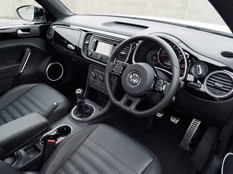 Говоря об интерьере Volkswagen New Beetle II поколения, стоит сказать, что он выглядит качественным, однако, немного скучным, преимущественно на фоне экстерьера. Можно заметить спартанскую приборную панель с полукруглым датчиком спидометра и цифровым одометром, увесистое рулевое колесо, где есть три «алюминиевые» спицы, а также массивную переднюю панель, увенчанную в центральной области магнитолой и блоком управлением «климатом».