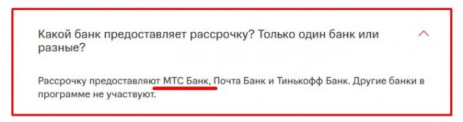 Здесь можно приобрести смартфон в рассрочку (не «собственную») от нескольких банков: МТС Банк, Тинькофф Банк и Почта Банк (список на конец 2021 года).