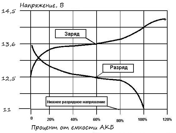 Эти процессы характеризуются напряжением батареи. Наверное, многие слышали, что напряжение на автомобильном аккумуляторе 12В, это не совсем правильно. Нормальный параметр это – 12,7В. Это своего рода 100% заряда.