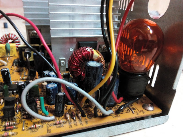 Припаял и посадил на клей лампу. Лампа 12 вольт 20 ватт запитана 5ю вольтами. Хотя на выходе 5и вольт стоит мощное сопротивление (номинал даже не стал смотреть), которое видимо не даёт блоку питания работать на холостом ходу создавая некую нагрузку. (АХТУНГ! импульсные блоки питания нельзя включать без нагрузки если нет соответствующей защиты. А есть ли такая защита в этом БП неизвестно. Ну поэтому лампочка не будет лишней. )