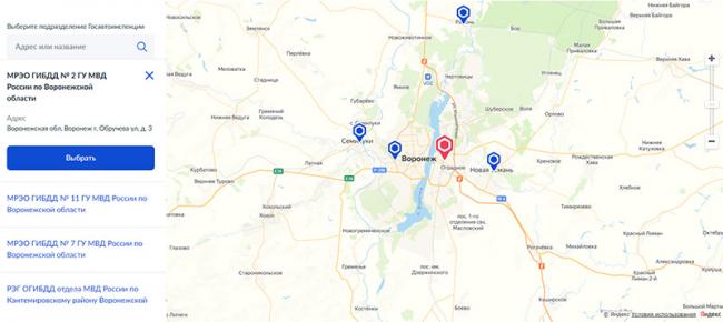 7. Последним шагом будет выбор удобного подразделения ГИБДД и запись на прием. Сначала заявитель указывает регион своего местонахождения, после система показывает возможные для выбора подразделения на карте. Изучайте их и выбирайте удобное: