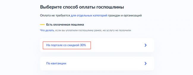 При оплате онлайн через Госуслуги на этот вид пошлины действует скидка. Внести нужно будет 350 рублей. Если платить наличными по квитанции, которую можно распечатать, плата составит стандартные 500 рублей.