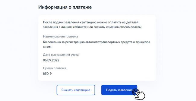 Заявление отправляется на регистрацию. Вскоре после этого (обычно через 30 минут, не больше) в личном кабинете заявителя на портале Госуслуги открывается возможность оплаты госпошлины за постановку купленной машины на учет.