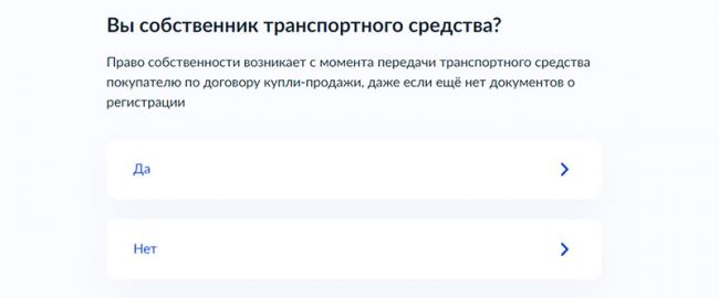 2. Первым делом система попросит указать, кто подает заявление. Под собственником понимается покупатель, а не человек, которому пока что машина принадлежит по документам. Будем рассматривать именно вариант собственника, так как он самый распространенный.
