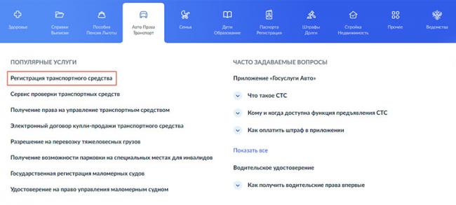 Шаг 2. Перейдите на главную страницу ко вкладке «Авто Права Транспорт». Выберите пункт «Регистрация транспортного средства».