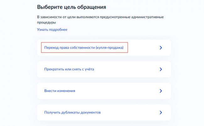 Шаг 7. Нажмите на кнопку «Продолжить» и в следующем окне выберите услугу. В нашем случае это «Переход права собственности (купля-продажа)».
