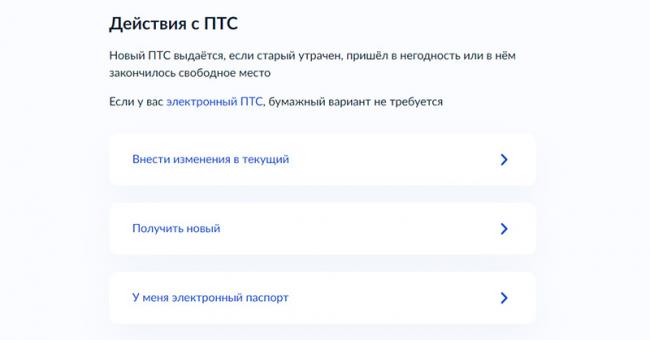 Затем выберите, что нужно сделать с ПТС: внести изменения в текущий или получить новый. Если ПТС электронный, выберите пункт «У меня электронный паспорт».