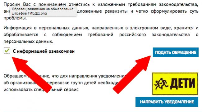 - Перейти по ссылке и ознакомиться с представленной информации. На странице подробно описаны особенности взаимодействия с подразделением посредством отправки онлайн обращения. Если все нюансы понятны, нужно поставить галочку в графу С информацией ознакомлен, а затем кликнуть на пункт Подать обращение.