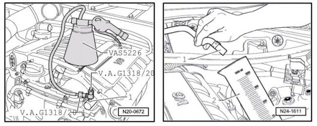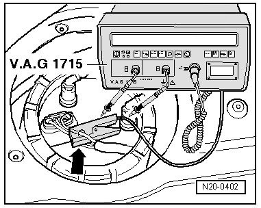 – Подсоединить мультиметр -V.A.G 1715- с токовыми клещами к контакту -1—стрелка- 4-контактного разъёма жгута проводов для левого модуля подачи топлива.