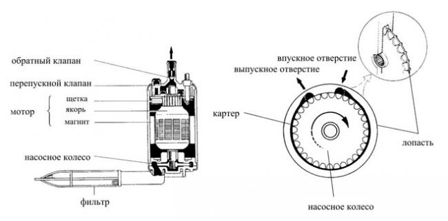 Электрическая часть насоса представляет собой электромотор постоянного тока, работающий от бортовой сети с напряжением 12 В.