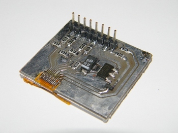 При монтаже дисплея сначала припаивается шлейф, затем дисплей заворачивается на другую сторону платы и сажается на двухсторонний скотч, для надежности можно еще зацепить за один уголок тонкой проволочкой.