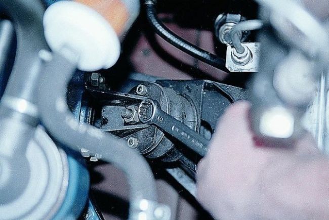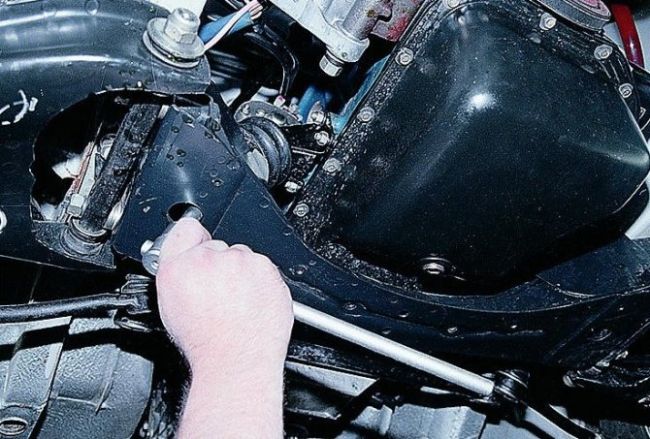 11. Отвернуть нижние гайки крепления подушек двигателя.
