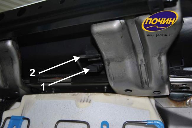 Под сиденьем находятся колодки жгутов проводов обогрева сиденья и сигнальной лампы непристегнутого ремня безопасности.