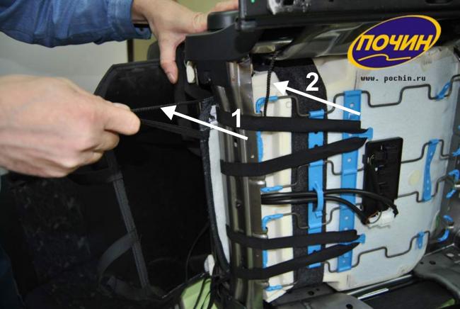 11. Устанавливаем боковую пластмассу на переднем сиденье. Сначала закрепляем пластиковый крепеж 1, затем 2.