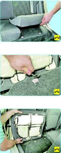 Чтобы снять задние сиденья, нужно приподнять переднюю часть подушки и вывести два крепежных крючка из кронштейнов на кузове автомобиля. После этого отсоединенная подушка вынимается из салона. Вторая часть сиденья снимается аналогичным образом. Также требуется демонтировать ремень безопасности среднего пассажира и сдвоенный замок задних ремней безопасности.