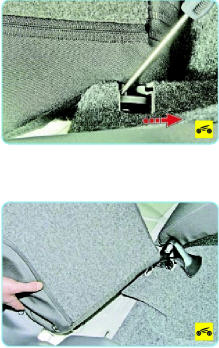 Далее, с помощью плоской отвертки или монтажной лопатки необходимо сдвинуть фиксаторы нижних креплений спинки заднего сиденья и снять спинку заднего кресла.