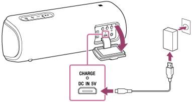 Подключите кабель микро- USB (прилагается) к разъему DC IN 5V динамика, а затем подключите другой конец к USB -адаптеру переменного тока (доступен в продаже). После этого подключите USB -адаптер переменного тока к розетке переменного тока.