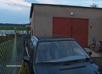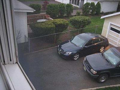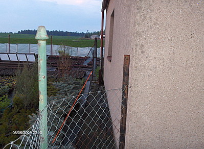 Улица, соответственно, перпендикулярно носам машин. Закуток между сеткой и крыльцом — именно то место где эта тварь пасётся. Ну и между кустами — где трава вытоптана.