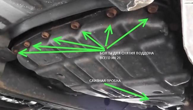 - Определить местоположения сливного отверстия трансмиссионной жидкости и болтов, которые фиксируют поддон. Там находится фильтр.