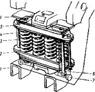 Пружинная подвеска двигателя состоит из двух балочек (обойм) 2, 5 (см. рис.36), между которыми установлены четыре витых пружины 3. Перед установкой на место пружинный комплекс стягивают болтами 4, пропущенными в отверстия на концах обойм. Комплект установлен между опорными кронштейнами 1 рамы тележки. Для фиксации его в раме тележки через сквозные отверстия в кронштейнах рамы и обоймах пропущены стержни 6, опирающиеся на валики 7, установленные в нижних кронштейнах рамы тележки. От выпадания валики предохранены штифтами. Кронштейны двигателя, охватывающие пружинную подвеску сверху и снизу, имеют сменные приварные пластины из стали 60Г. Пластины из такой же стали приварены к верхней и нижней балочкам.
