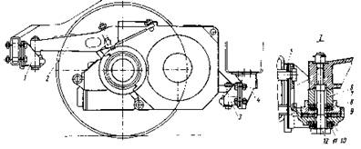 Для обеспечения перемещения коробки без заедания она в направляющих корпусах подпружинена четырьмя пластинчатыми пружинами — по две снизу и две сверху. Пластинчатые пружины задним концом прикреплены к кожуху, а передние скользят в пазах коробки польстера. Рычаг 10 и пружины 9 закреплены на корпусе осью 2 и стержнем 1. Для удержания рычага 10 в поднятом положении во время вынимания польстерного пакета на стержень 1 установлен пружинный фиксатор 3, свободный конец которого не дает возможности установить крышку 6 масляной ванны подшипника, если польстер не установлен на место и рычаг 10 не опущен в рабочее положение.