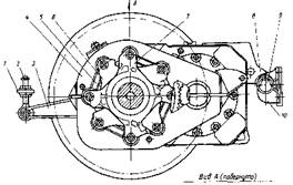 В отверстия цапф посажены с натягом 0,09—0,12 мм пальцы 3, на которые надеваются головки поводков с резинометаллическими шарнирами. Вторые головки соединены с пальцами 16, укрепленными в приливах колесного центра. От осевого смещения поводки удерживаются ограничительными шайбами и головками болтов, ввернутых в отверстия пальцев с резьбой и зафиксированных стопорными пластинами. Поводки, объединяющие пальцы приводного фланца и колесного центра, образуют шарнирно-рычажную муфту, приводящую в движение колесную пару.
