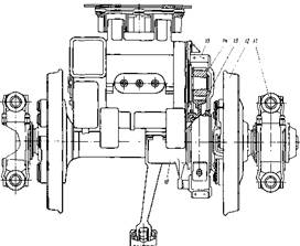 При системе с полым карданным валом на тепловозе ТЭП70 последних выпусков двигатель также закреплен в раме тележки в трех точках (рис.41.). Передней частью он подвешен к кронштейнам рамы тележки 1 с помощью подвесок 2, верхние концы которых закреплены гайками к полкам кронштейнов, а нижние связаны валиками с кронштейнами 3 опор 16, имеющими общую с опорами отливку, прифланцованную к двигателям. Кронштейны крайних и среднего двигателей тележки отличаются друг от друга формой и длиной. Задняя часть двигателя имеет специальные, отлитые заодно с корпусом опорные приливы 8, которыми двигатели опираются на валики 9 с клиновыми скосами, укрепленные в цилиндрических расточках кронштейнов 10 рамы тележки. Для создания натяга между валиками и приливами двигателя в клиновом пазу предусмотрен зазор, который после стягивания болтами должен быть не менее 3мм.