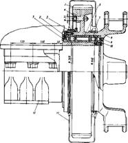 Наружные и внутренние кольца роликовых подшипников 7 зафиксированы от смещения дистанционными кольцами 6 и крышками 1, 2, 9, 10. Крышки подшипников, укрепленные на опоре 12 и в ступице 8, образуют лабиринтные уплотнения, предотвращающие попадание пыли и грязи в полость подшипников, заполненную смазкой. Зубчатый редуктор 4 закрыт кожухом 15 (см. рис. 41), прикрепленным к двигателю четырьмя болтами.