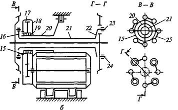Конструкции четвертой группы приводов близки к конструкции приводов с опорно-осевым подвешиванием (рис. 22). Здесь тяговый двигатель опорно-осевыми подшипниками опирается на полый вал, упруго соединенный с колесами. На валу насажены ведомые шестерни. Последние с помощью подвижных элементов соединены с колесной парой. Приводы такой конструкции (фирмы «Сименс-Шуккерт») применяются на некоторых типах немецких электровозов (Е10, Е40 и др.). Детальное описание конструкций опорно-осевого и опорно-рамного подвешивания привода дано в работе [34].
