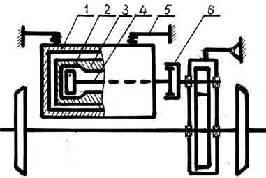 1 — полый вал; 2 — тяговый двигатель; 3 — ведущая шестерня; 4 — ведомая шестерня; 5 — подвижные элементы; 6 — диск колесного центра