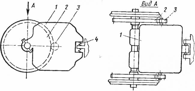 - — тяговый двигатель; 2 — ведомая шестерня редуктора; 3 — ведущая шестерня редуктора; 4 — упругая подвеска двигателя на раме тележки