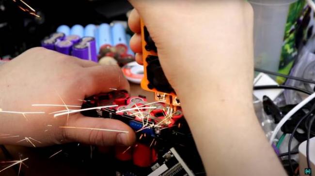 Для того чтобы объединить аккумуляторные батареи 18650, потребуется специальная металлическая пластинка. Перед тем как проводить работы, нужно закрепить все батарейки при помощи изоляционной ленты или другого инструмента. Далее нужно поднести металлическую ленточку и подать электрический ток для создания точек. Если аппарат выдаёт слишком большую силу тока, то нужно учитывать, что он может прожечь металлическую пластину. Подбирать подходящую ленточку нужно исходя из выдаваемой силы тока.