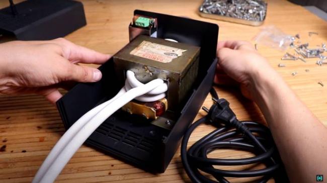 Размещаем внутри корпуса МОТ, импульсный блок питания на 12 вольт и запихиваем внутрь сетевой провод. Длина его полтора метра. Распределяем все необходим провода по своим разъемам, и в принципе все. С электроникой разобрались.