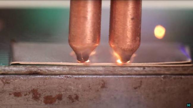 Подводные камни. Их очень много, в первую очередь тут нужно понимать физику протекания тока в металле. Металл в месте соприкосновения с электродами представляет току наибольшее сопротивление и потому место будет сильно нагреваться. Наша задача разогреть металл до такой степени, чтобы создалось так называемое сварочное ядро. Нагрев в этом процессе должен происходить не под самими электродами, а между листами металла. Сварные ядра при этом необходимо делать как можно быстрей, очень мощным и коротким импульсом. Если греть место сварки медленно, тепло будет разбегаться по аккумулятору кто куда, без достижения нужного результата.