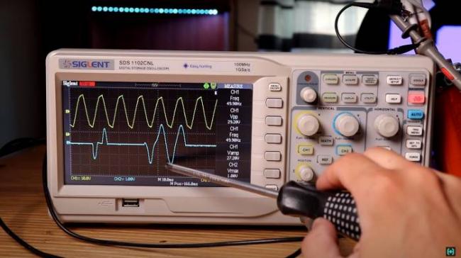 На других банках сварка проходила несколько иначе, прожиг был меньше, но зато лента между электродами разогревалась до красна. Это было довольно любопытно. При том на одних аккумуляторах лента приваривалась так, что ее практически не оторвать, а на других при том же времени сварки эффекта не было вообще. Лента в прямом смысле отлипала от корпуса, оставляя только две вмятины на металле. Разобраться в проблеме помог цифровой осциллограф, который способен записать сигнал для его дальнейшего изучения.