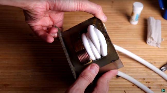 Внутренние отверстия магнитопровода смажем вазелином. Ту же процедуру проводим с кабелем. Несмотря на то, что кабель достаточно тонкий по сравнению со своими более дешевыми собратьями, в трансформатор нужно попытаться вместить 4-5 витков. Но вот незадача. 700 Вт МОТ позволяет вместить в себя только 3 витка. Не беда! На помощь приходит система рычагов и отвёрток. В общем, включив смекалку и мотаем 4 витка в такой небольшой трансформатор.