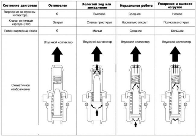 Принцип работы клапана вентиляции картерных газов основан на перепаде давления. За счет этого механизм может находиться в 4 положениях: