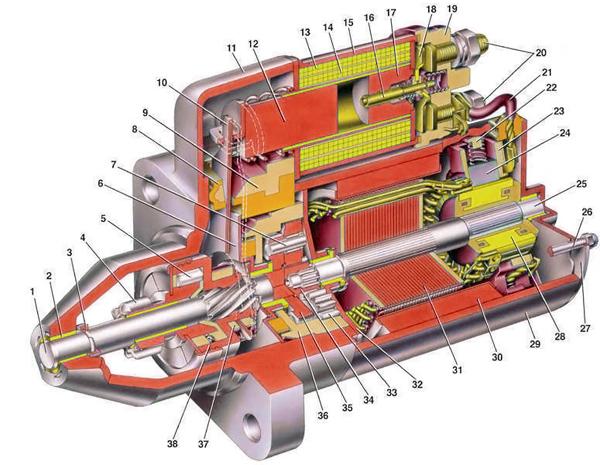 Стартер – достаточно сложный механизм, преобразующий электроэнергию в механическую силу, которая и запускает двигатель. Стартер состоит из электрической и механической части.