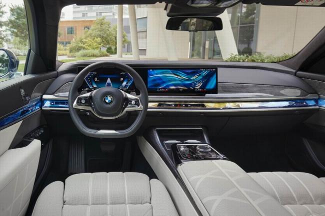 Салон БМВ 7-серии 2023 в новом кузове спроектировали по принципам скандинавского дизайна, то есть он тоже минималистичный. Передняя панель имеет нарочито упрощенную горизонтальную архитектуру, которая должна вызывать ассоциации с офисными интерьерами.